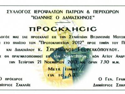 Η φετινή εκδήλωση του ιστορικού Συλλόγου των Ιεροψαλτών της Πάτρας θα έχει διττό χαρακτήρα, καθώς από τη μία τα μέλη του χορού του συλλόγου θα αποδώσουν βυζαντινούς ύμνους, από την ακολουθία του Πολιούχου και Προστάτου της Αποστολικής Εκκλησίας των Πατρών Αποστόλου Ανδρέου του Πρωτοκλήτου ενώ από την άλλη θα τιμηθεί το πρόσωπο του διαπρεπούς πρωτοψάλτου και διδασκάλου της ιεράς τέχνης του Δαμασκηνού, Σπυρίδωνος Γεωργακόπουλου.