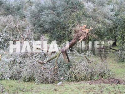 Από την άλλη είχαμε πτώσεις δέντρων σε πολλά σημεία με κυριότερα αυτά στην Ε.Ο. Πατρών – Πύργου στο ύψος του Παλαιοχωρίου και στην Ε.Ο. Πύργου – Κυπαρισσίας στο ύψος του Καϊάφα, όπου και πάνω σε πεσμένο δέντρο προσέκρουσε αυτοκίνητο.