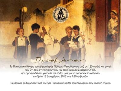 Μια όμορφη εκδήλωση πραγματοποιείται σήμερα το απόγευμα στην Ιερή Πόλη του Μεσολογγίου. 120 παιδιά θα πουν τα κάλαντα σε γειτονιές της πόλης Τα κάλαντα θα ξεκινήσουν από την Αγία Παρασκευή.
