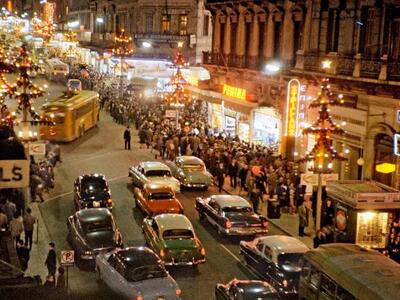 Η νέα φωτογραφία – που προέρχεται και πάλι από τη συλλογή του Κώστα Μπαλάφα στα Φωτογραφικά Αρχεία του Μουσείου Μπενάκη- απεικονίζει ξανά μια γιορτινή πόλη που θυμίζει Νέα Υόρκη.