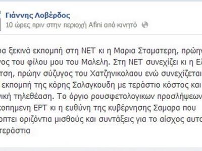Ο Γιάννης Λοβέρδος έγραφε: «Σήμερα ξεκινά εκπομπή στη ΝΕΤ κι η Μαρία Σταματέρη, πρώην σύζυγος του φίλου μου του Μαλέλη. Στη ΝΕΤ συνεχίζει κι η Ελένη Κατρίτση, πρώην σύζυγος του Χατζηνικολάου ενώ συνεχίζεται κι η άθλια εκπομπή της κόρης Σαλαγκούδη με τεράστιο κόστος και μηδενική τηλεθέαση. Το όργιο ρουσφετολογικών προσλήψεων στη χρεοκοπημένη ΕΡΤ κι η ευθύνη της κυβέρνησης Σαμαρά που περικόπτει οριζόντια μισθούς και συντάξεις για το αίσχος αυτό είναι τεράστια».