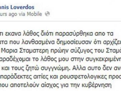 Αμέσως ο Γιάννης Λοβέρδος ανάρτησε στο προφίλ του την συγγνώμη του: