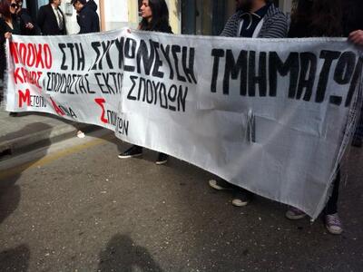 Φωνάζουν συνθήματα και έχουν απλώσει στο δρόμο ένα μεγάλο πανό που γράφει: Πίσω από τους αριθμούς υπάρχουν άνθρωποι. Καμία σχολή δεν θα καταργηθεί.