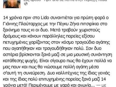 Το πρωί του Σαββάτου 23 Φεβρουαρίου η τραγουδίστρια Πέγκυ Ζήνα γράφει στο Facebook για την επικείμενη συνεργασία της με τον Γιάννη Πλούταρχο.