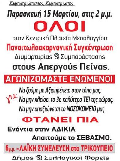 Εντείνονται οι κινητοποιήσεις κατά του σχεδίου Αθηνά, μετά από απόφαση που πάρθηκε στη σύσκεψη της Συντονιστικής Επιτροπής Δήμου και Φορέων, παρουσία πολιτών. Κατά την σύσκεψη αποφασίστηκε την Παρασκευή 15 Μαρτίου και ώρα 2:00 μμ, η διοργάνωση Παναιτωλοακαρνανικής Συγκέντρωσης Διαμαρτυρίας και συμπαράστασης στους Απεργούς Πείνας που διανύουν την τέταρτη ημέρα αγώνα, αλλά και Λαϊκή Συνέλευση στις 6:00 μμ την ιδία μέρα στο Τρικούπειο Πολιτιστικό Κέντρο Μεσολογγίου.