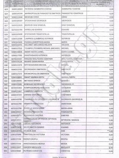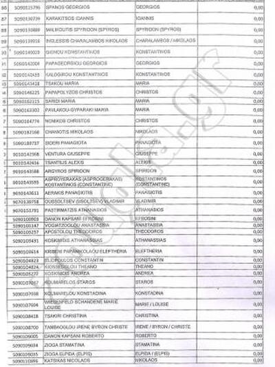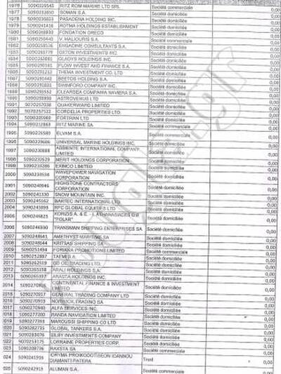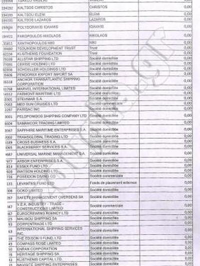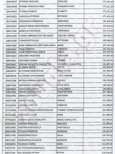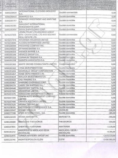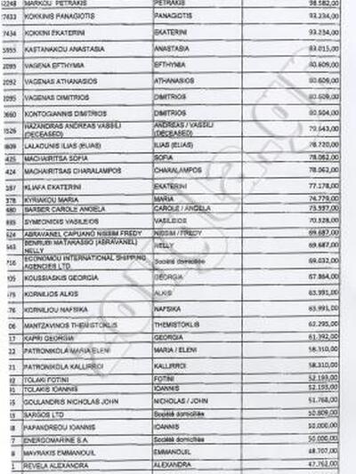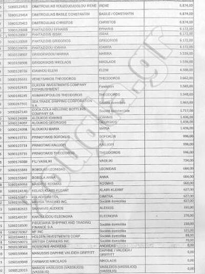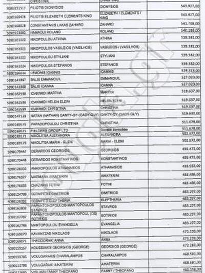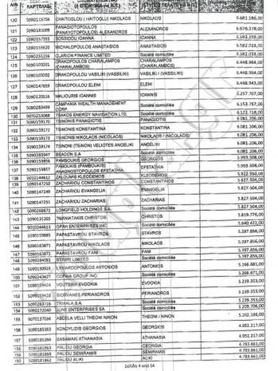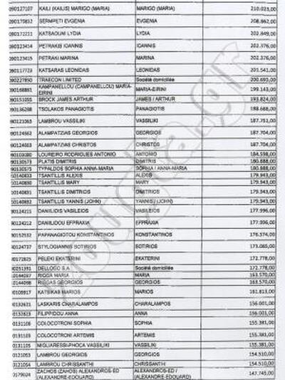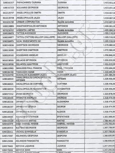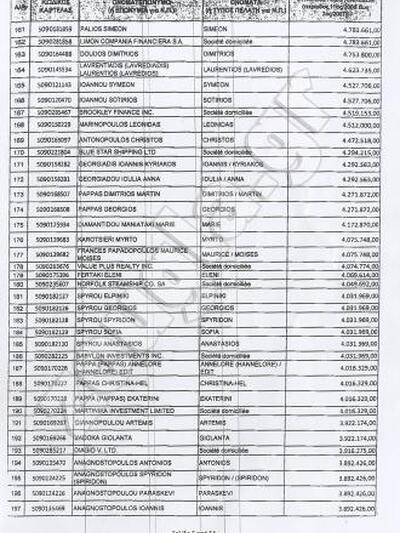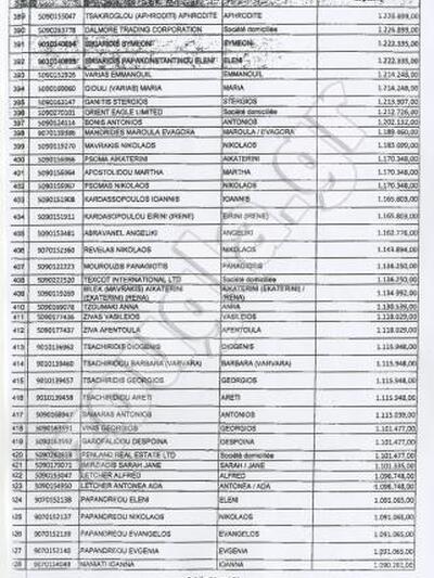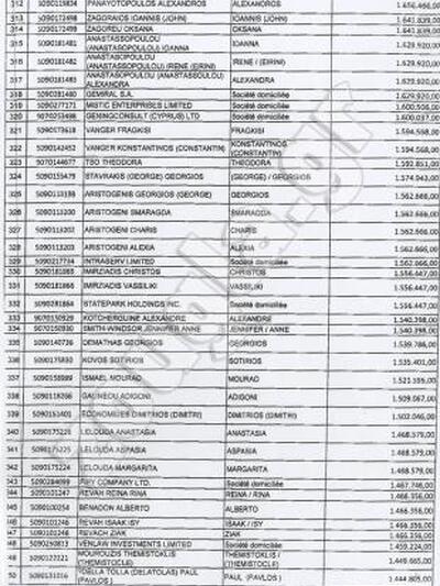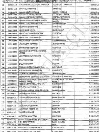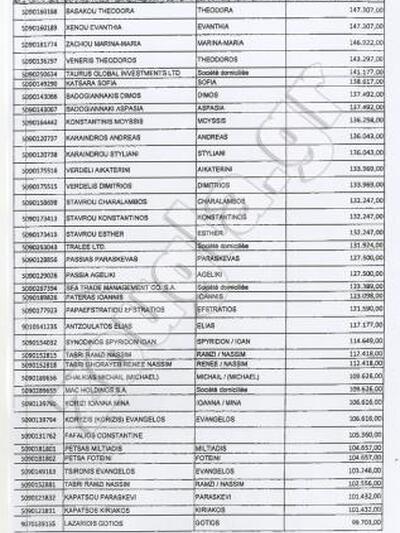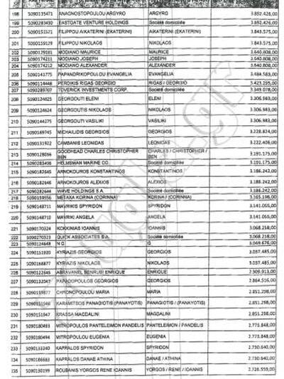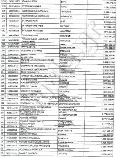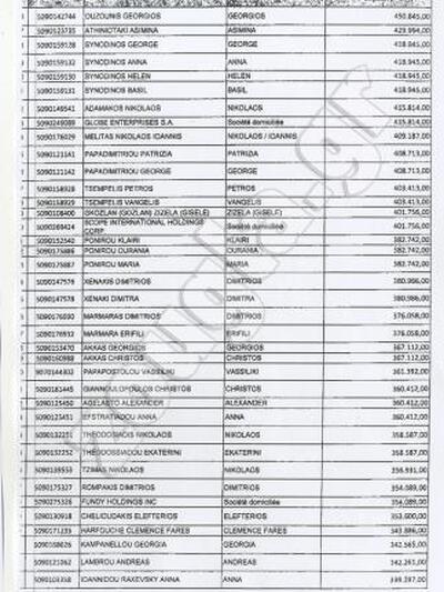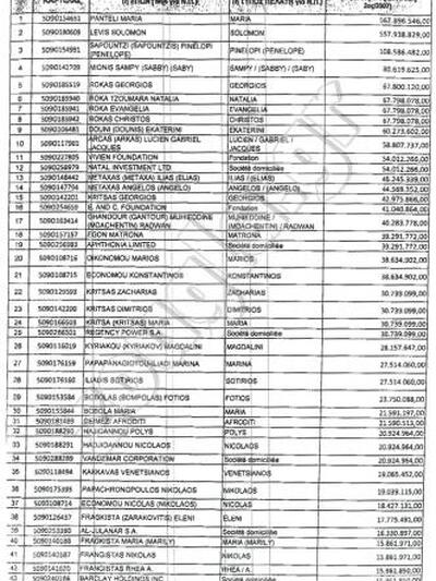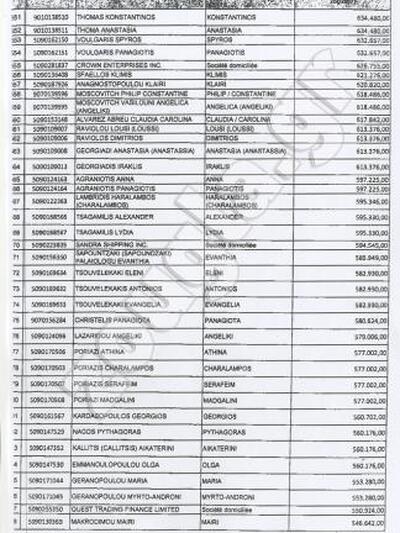 Πρώτο στον κατάλογο, εμφανίζεται το όνομα «PANTELI MARIA» με ποσό ύψους 562.896.546 δολάρια. Ακολουθεί το όνομα «Levis Solomon» με ποσό 557.938.829 δολάρια και το «Sapountzi (Sapountsis) Pinelopi (Penelope) με 108.586.482 δολάρια ενώ η πρώτη τετράδα κλείνει με τον «Mionis Sampy (Sabby) (Saby) με 80.619.625 δολάρια.