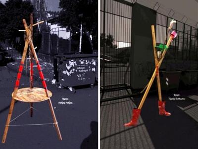 Η μορφή: Το έργο έχει αυτή τη μορφή ώστε να υπάρχει απλότητα στη κατασκευή. Τρεις (3) ευθείες δεμένες στη μέση φτιάχνουν την Κρεμάστρα του Δημόσιου Χώρου, την οποία καθένας από μας και με ό,τι διαθέτει, μπορεί να κατασκευάσει.