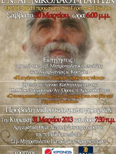 Μία ξεχωριστή εκδήλωση αφιερωμένη στη μνήμη του Γέροντα Παισίου του Αγιορείτου που εκοιμήθη πριν από 19 χρόνια, στις 12 Ιουλίου του 1994, θα πραγματοποιηθεί το ερχόμενο Σάββατο 30 Μαρτίου 2013 στις 6.30 το απόγευμα στον ιερό ναό του Αγίου Νικολάου Πατρών και προβλέπεται να συγκεντρώσει πολύ κόσμο.