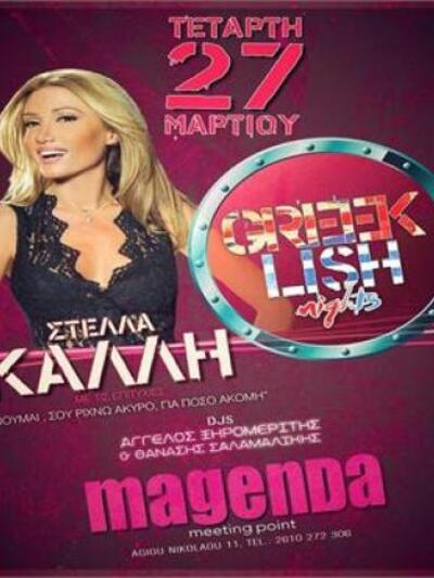Πρόκειται για ένα Greeklish Night του μπαρ Magenda όπου γκεστ καλεσμένη θα είναι η εκρηκτική Στέλλα Καλλή, η οποία αν και είχε αρκετά χρόνια στη νύχτα και το τραγούδι, πέτυχε να ξεχωρίσει και να αρχίσει να γίνεται ευρέως γνωστή τα τελευταία ένα-δύο χρόνια.