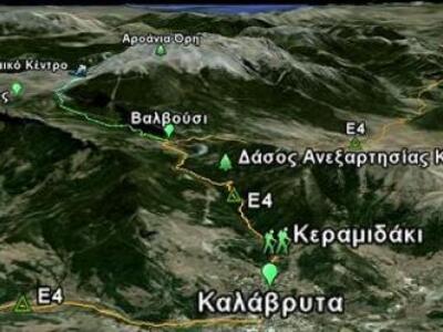 Η έναρξη του μονοπατιού «Καλάβρυτα – Χιονοδρομικό Κέντρο» πραγματοποιείται πλησίον της θέσεως «Κεραμιδάκι» Καλαβρύτων και ακολουθώντας τη διαδρομή του Ευρωπαϊκού μονοπατιού Ε4 για 5 χλμ. περίπου, διέρχεται από τη θέση «Βαλβούσι». Στο σημείο αυτό αφήνει το μονοπάτι Ε4 και ακολουθεί για ακόμη 5 περίπου χλμ. την ανατολική διαδρομή μέσω του Ξηρόκαμπου μέχρι και τις εγκαταστάσεις του Χιονοδρομικού κέντρου και το Ορειβατικό καταφύγιο.