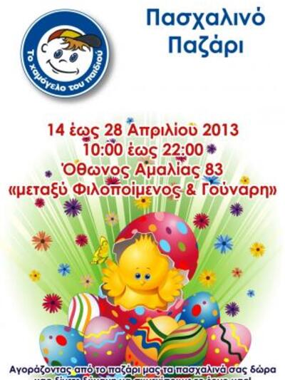 O Εθελοντικός Οργανισμός «Το Χαμόγελο του Παιδιού» διοργανώνει το 3ο Πασχαλινό Παζάρι  που θα πραγματοποιηθεί στο εθελοντικό του εργαστήρι που βρίσκεται στον 4ο όροφο  του χώρου των γραφείων του στην Πάτρα και στην οδό Όθωνος Αμαλίας 83  (μεταξύ Φιλοποίμενος και Γούναρη), από Κυριακή 14 Απριλίου 2013 έως και Κυριακή 28 Απριλίου 2013, καθημερινά 10:00-22:00.