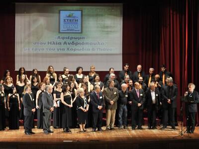 Στο τέλος της επιτυχημένης αυτής πρωτοβουλίας της ΣΤΕΓΗΣ ΕΛΛΗΝΙΚΩΝ ΧΟΡΩΔΙΩΝ, Αφιέρωμα στον Ηλία Ανδριόπουλο το Διοικητικό Συμβούλιο, δια του Πρόεδρου του Θωμά Λουζιώτη και του Γεν. Γραμματέα Γιώργου Γεωργόπουλου, όλων των μελών του επί σκηνής, αλλά και του τέως Προέδρου του Μαέστρου Αλέξανδρου Παπαγιαννόπουλου, τίμησε τον συνθέτη ο οποίος απευθυνόμενος στο ακροατήριο, εστίασε το λόγο του στη δημιουργική εργασία των χορωδιών και την ανάδειξη του ποιοτικού τραγουδιού, για "μια Ελλάδα που όλοι θέλουμε, ενάντια στην τραγική πραγματικότητα του σήμερα".