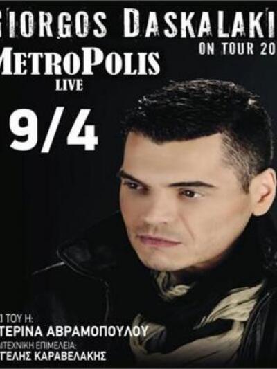 Ένας δημοφιλής λαικός τραγουδιστής, ο Γιώργος Δασκαλάκης θα εμφανιστεί live σήμερα Παρασκευή 19 Απριλίου 2013 στις 11 το βράδυ στο METROPOLIS LIVE, στην οδό Τσαμαδού, πλησίον της Αγίου Ανδρέου, στην Πάτρα