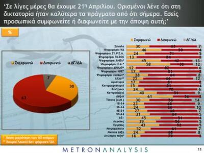 Η δημοσκόπηση δείχνει σημαντικό ποσοστό των ψηφοφόρων να απαντά θετικά στην ερώτηση “Σε λίγες μέρες θα έχουμε 21η Απριλίου. Ορισμένοι λένε ότι στη δικτατορία ήταν καλύτερα τα πράγματα από ότι σήμερα. Εσείς προσωπικά συμφωνείτε ή διαφωνείτε με την άποψη αυτή;”