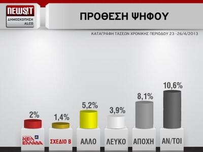 Κατά τα λοιπά, ένα εντυπωσιακό στοιχείο της δημοσκόπησης είναι ότι το νεοπαγές κόμμα του Ανδρέα Λοβέρδου (ΣΥΜΦΩΝΙΑ ΓΙΑ ΤΗ ΝΕΑ ΕΛΛΑΔΑ) συγκεντρώνει 2% που δειχνει αιμορραγία και καταποντισμό του ΠΑΣΟΚ, και ο σχηματισμός του Αλέκου Αλαβάνου (ΣΧΕΔΙΟ Β) ο οποίος χωρίς να έχει καν υποδομή ως κόμμα συγκεντρώνει 1,4%. Αυτό σίγουρα δημιουργεί προβληματισμό στην Κουμουνδούρου η οποία ούτως ή άλλως έχει και μέσα στον ΣΥΡΙΖΑ, υποστηρικτές της επιστροφής στην δραχμή.