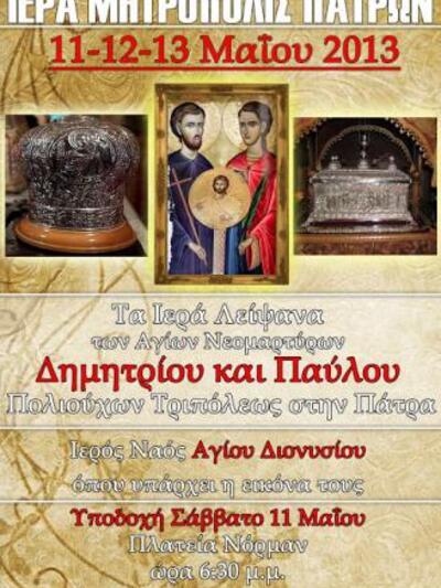 Κυκλοφόρησε η σχετική αφίσα για την Υποδοχή των Ιερών Λειψάνων των Αγίων Νεομαρτύρων Δημητρίου και Παύλου, Πολιούχων της Τριπόλεως, που θα λάβει χώρα στην πλατεία Νόρμαν της Πάτρας το Σάββατο της Διακαινησίμου 11 Μαίου 2013 στις 18.30.