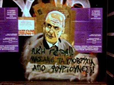 Δεν είναι μόνο το γκράφιτι έξω από τον Ευαγγελισμό, υπάρχει και αλλού στην Aθήνα γκράφιτι με ήρωα τον Ακη Τσοχατζόπουλο και ένα απίστευτο σύνθημα- λογοπαίγνιο.