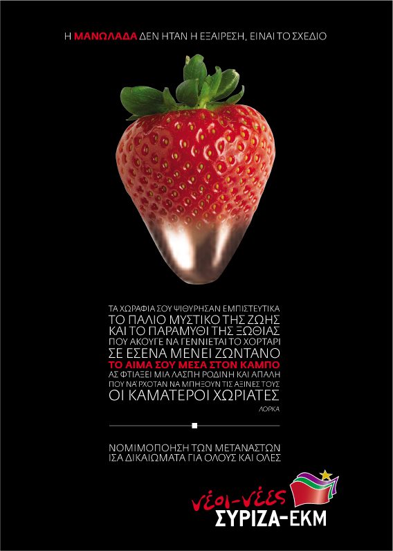 Στην αφίσα η φράουλα παίρνει τη μορφή σφαίρας για να καταδικάσει συμβολικά τα πρόσφατα επεισόδια εναντίον μεταναστών-εργατών στα φραουλοχώραφα. Επίσης, παρατίθεται και ένα απόσπασμα από ποίημα του Λόρκα αλλά ...ενεπλάκη ο δαίμων της γραμματικής και το ρήμα «ψιθύρισαν» γράφεται «ψιθύρησαν».