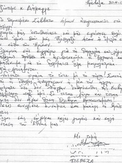 Στην επιστολή του στον Δήμαρχο Αγρινίου Παύλο Μοσχολιο΄ο Ηλίας Σωτηρέλης από την Πρέβεζα αναφέρεi΄