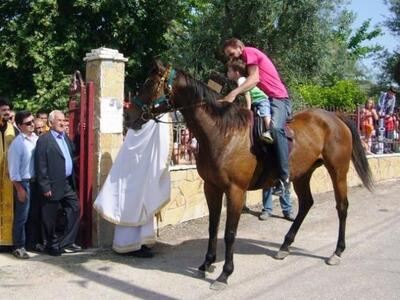 Συγκινητική ήταν και η παρουσία μικρών παιδιών μαζί με τους πατεράδες τους, να έρχονται καβάλα και να προσκυνούν από την πλάτη του ζώου.