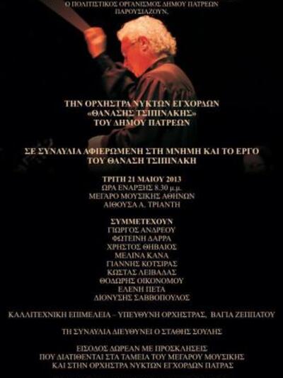O Θανάσης Τσιπινάκης δεν θα είναι εκεί, αλλά δεν θα λείπει. Γνωστοί και σπουδαίοι ερμηνευτές που συνεργάστηκαν μαζί του και με την Ορχήστρα Νυκτών Εγχόρδων του Δήμου Πατρέων θα δώσουν το παρών.Γιώργος Ανδρέου, Φωτεινή Δάρρα, Χρήστος Θηβαίος, Μελίνα Κανά, Γιάννης Κότσιρας, Κώστας ΛειβαδάςΘοδωρής Οικονόμου, Ελένη Πέτα και Διονύσης Σαββόπουλος είναι οι καλλιτέχνες που συμμετέχουν στη μεγάλη συναυλία που θα πραγματοποιηθεί την Τρίτη 21 Μαΐου 2013 στο Μέγαρο Μουσικής Αθηνών και είναι αφιερωμένη στη μνήμη και το έργο του μαέστρου, Καλλιτεχνικού Διευθυντή και ιδρυτή της Ορχήστρας Νυκτών Εγχόρδων του Δήμου Πατρέων Θανάση Τσιπινάκη, που έφυγε πρόωρα από τη ζωή στα τέλη του 2012.