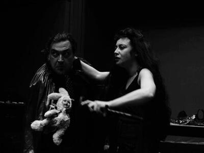 Η Ιφιγένεια Αστεριάδη και ο Γιάννης Στεφόπουλος, ηθοποιοί με μακρά πορεία στο θέατρο, στην τηλεόραση και στον κινηματογράφο, μεταμορφώνονται και ερμηνεύουν με ένταση τους πολλαπλούς ρόλους του έργου, σε μια συνεχή χορογραφία που αποδίδει το γελοίο και κωμικοτραγικό χαρακτήρα του έργου.