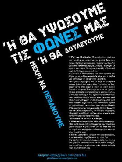 Η αφίσα κολλήθηκε σε 2000 κομμάτια στην Αττική και στην Πάτρα. Ο λόγος που βγήκε αυτή η αφίσα ήταν ο θάνατος της Ράντκα Νικόλοβα εν ώρα εργασίας σε πιτσαρία στην Πάτρα στην οδό Αγίας Σοφίας. Στην αφίσα, επίσης, περιγράφονται οι συνθήκες εργασίας της πρωινή βάρδιας, (δηλαδή τη βάρδια που η Ράντκα πέθανε).