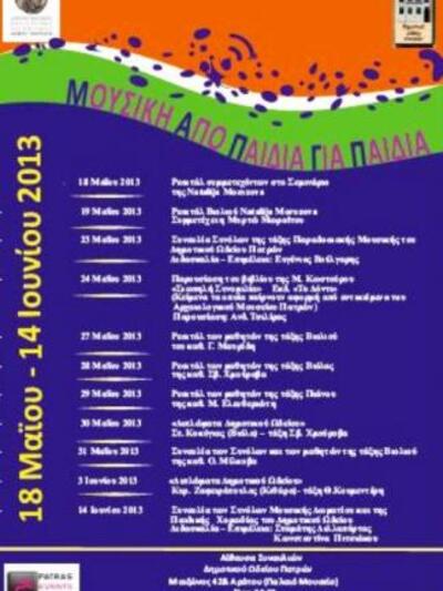 Με την συναυλία των συνόλων της Τάξης Παραδοσιακής Μουσικής του Δημοτικού Ωδείου Πατρών – Διδασκαλία – Επιμέλεια Ευγένιου Βούλγαρη συνεχίζονται αύριο (Πέμπτη) 23 Μαΐου στις 8.30 το βράδυ οι εκδηλώσεις της Ενότητας του Δημοτικού Ωδείου Πατρών με το Γενικό τίτλο «ΜΟΥΣΙΚΗ ΑΠΟ ΠΑΙΔΙΑ ΓΙΑ ΠΑΙΔΙΑ».