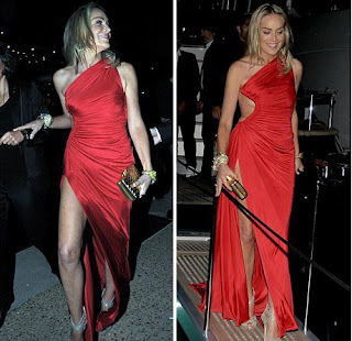 Στο πάρτι στο σκάφος του διάσημου μόδιστρου Ρομπέρτο Καβάλι, η Στόουν επέλεξε ένα κατακόκκινο μακρύ φόρεμα με ανοιχτή πλάτη και μεγάλο σκίσιμο στο πλάι, που αναδείκνυε τα καλλίγραμμα πόδια της.