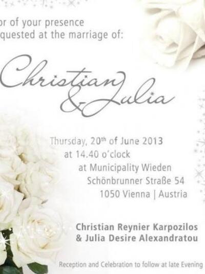 Το μυστήριο θα τελεστεί στη Βιέννη, όπως είχε δηλώσει από την πρώτη στιγμή η ίδια, στις 20 Ιουνίου, ενώ είναι γραμμένη και στα αγγλικά, προκειμένου να είναι κατανοητή και από τους νέους φίλους του ζευγαριού στην Αυστριακή πόλη.