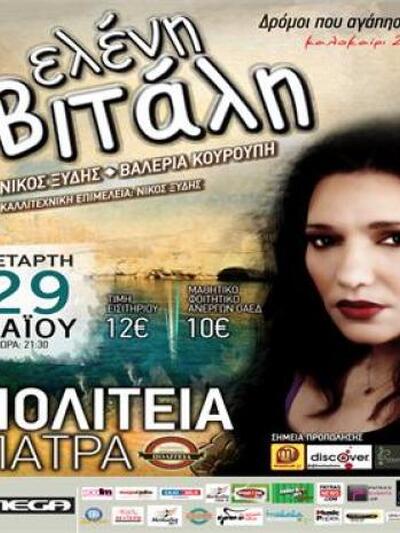 Η μεγάλη Ελληνίδα ερμηνεύτρια Ελένη Βιτάλη απόψε Τετάρτη 29 Μαίου 2013 στις 21.30, θα δώσει ένα μοναδικό live στον πολυχώρο Πολιτεία, στην Ακτή Δυμαίων στην Πάτρα επιχειρώντας μια αναδρομή σε τραγούδια απ΄όλη τη δισκογραφική της πορεία.