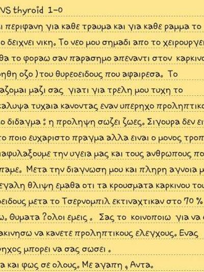 Με το κείμενο “Ada vs thyroid 1-0” μίλησε για το χειρουργείο που έκανε και την αφαίρεση του κακοήθη όζου που είχε στον θυρεοειδή κάτι που ανακάλυψε τυχαία, μετά από ένα προληπτικό υπέρηχο.