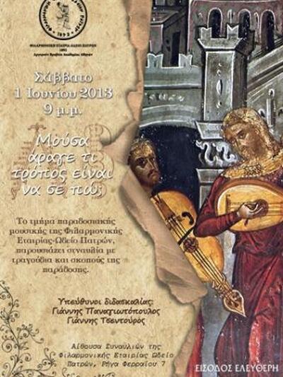 Με μία συναυλία από τους σπουδαστές του Τμήματος Παραδοσιακής Μουσικής της Φιλαρμονικής Εταιρίας Ωδείο Πατρών θα ολοκληρωθεί αυτό το Σάββατο 1η Ιουνίου 2013, στις 21.00 ο Μουσικός Μάιος 2013, ένα πολιτιστικό θεσμό που διοργανώνει εδώ και δεκαέξι συνεχόμενα χρόνια η Φιλαρμονική Εταιρία Ωδείο Πατρών, με τη στήριξη του Ιδρύματος Ι.& Ε. Τοπάλη.