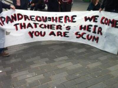 Πολλοί είναι αυτοί που ανεβάζουν φωτογραφίες στο twitter από το σημείο, ενώ έχει δημιουργηθεί και ειδικό hashtag. Στο πανό που βλέπουμε τον αποκαλούν διάδοχο της Θάτσερ και κάθαρμα...Θυμίζουμε ότι υπήρξε και συγκέντρωση υπογραφών προκειμένου να μην μιλήσει ο πρώην πρωθυπουργός στο συγκεκριμένο συνέδριο. O Γιώργος Παπανδρέου θα συμμετάσχει στην πρώτη συνεδρία με τίτλο «Στιγμές αλήθειας» ως ένας ηγέτης ο οποίος «αντλεί μαθήματα από την ελληνική κρίση χρέους και βοηθά την πλοήγηση της ΕΕ μέσα σε δύσκολα νερά».