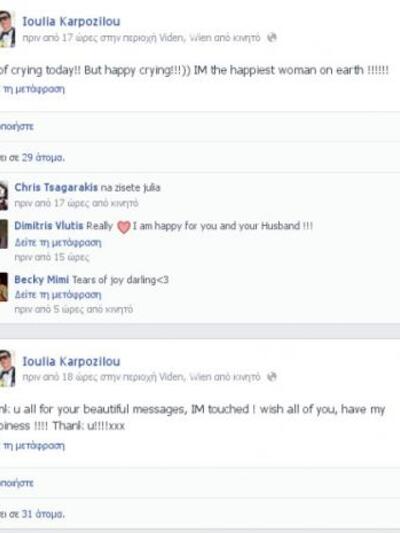«Σας ευχαριστώ όλους για τα όμορφα μηνύματά σας. Με άγγιξαν. Εύχομαι σε όλους σας να έχετε την ευτυχία μου! Ευχαριστώ», έγραψε γύρω στις 3 τα ξημερώματα η Τζούλια Αλεξανδράτου, ενώ μια ώρα αργότερα επέστρεψε γράφοντας: «Ημέρα κλάματος σήμερα. Αλλά κλάμα ευτυχίας. Είμαι η πιο ευτυχισμένη γυναίκα του κόσμου».