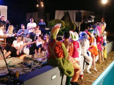Ο Χ. Καρκούλιας, η Μ. Κουρμπανά, ο Π. Βρυώνης και η Κριτική Επιτροπή μιλούν για το Καρναβάλι την ώρα που το γκρουπ 94 κανει επεισοδιακή έφοδο στο Poco Poco όπου γίνονται τα γυρίσματα..