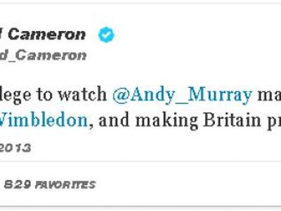 «Νιώθω προνομιούχος που είδα τον Άντι Μάρεϊ να κατακτά το Γουίμπλεντον και να κάνει υπερήφανη ολόκληρη τη Βρετανία», έγραψε στον προσωπικό του λογαριασμό στο twitter ο Πρωθυπουργός της Μεγάλης Βρετανίας, Ντέβιντ Κάμερον, μετά τη μεγάλη νίκη του Βρετανού τενίστα απέναντι στον Νόβακ Τζόκοβιτς.