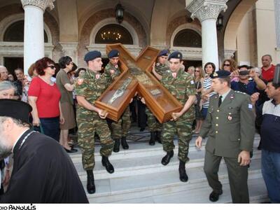 Ο Σταυρός εξήλθε επίσημα από το ναό και μεταφέρθηκε στο αεροδρόμιο του Αράξου. Μέχρι το αεροπλάνο τον συνόδευσε στρατιωτικό άγημα. Η περιφορά του θα γίνει με βαγόνι ειδικά διασκευασμένο από τους ρωσικούς σιδηροδρόμους για αυτό τον σκοπό.