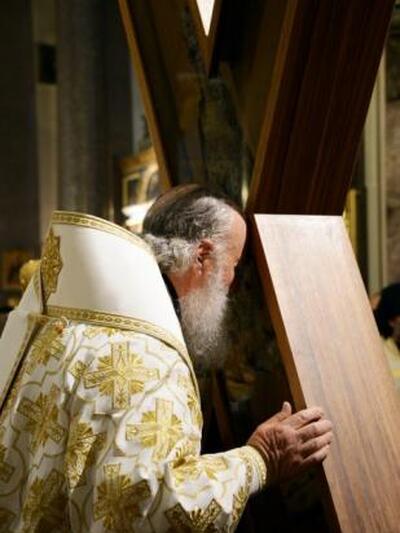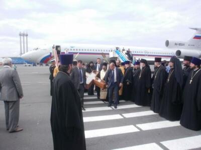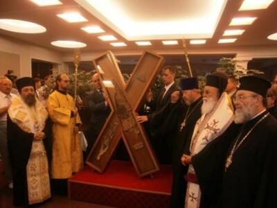 Τον σταυρό που συνόδευσαν οι Μητροπολίτες Πατρών και Μαντινείας της Εκκλησίας της Ελλάδος και εκ μέρους της ελληνικής Κυβέρνησης ο Γενικός Γραμματέας Ενημέρωσης κ. Ανδρέας Κατσανιώτης, υποδέχθηκε ο Πατριάρχης Μόσχας κ. Κύριλλος.
