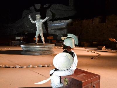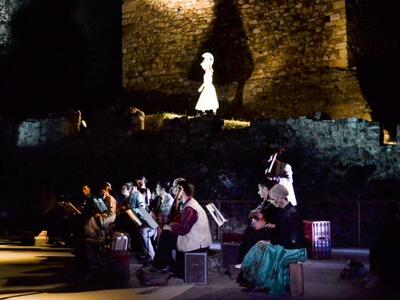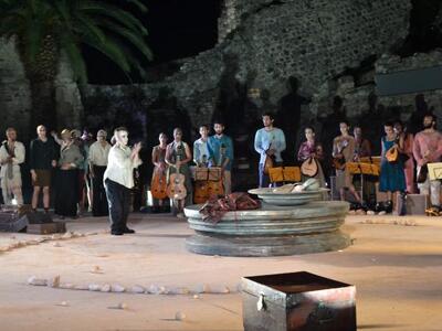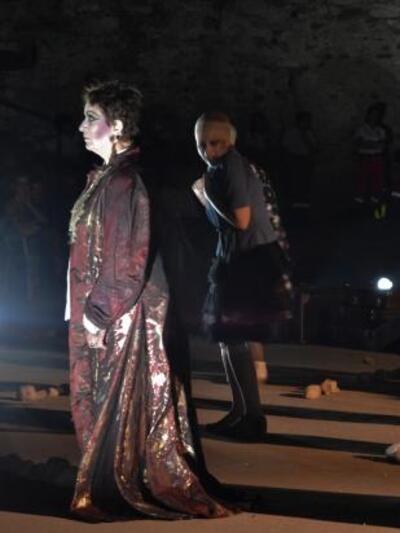 Το θετικό με την απαιτητική και καλοδουλεμένη αυτή παράσταση είναι η λειτουργική αξιοποίηση του χώρου του Κάστρου καθώς ο προμαχώνας αποτελεί το φυσικό σκηνικό και φόντο του έργου (το υπόλοιπο λιτό σκηνικό είναι ένας κύκλος με ένα βωμό και γύρω πέτρες και τα μέλη της Ορχήστρας Νυκτών Εγχόρδων "Θανάσης Τσιπινάκης").