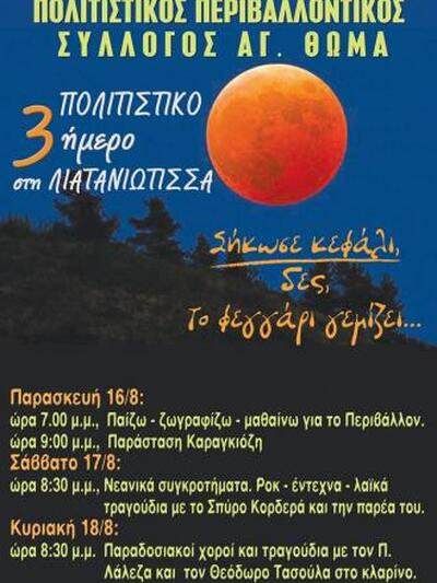 O Πολιτιστικός - Περιβαλλοντικός Σύλλογος Αγίου Θωμά Τανάγρας διοργανώνει τριήμερο φεστιβάλ με τίτλο «Σήκωσε κεφάλι, δες, το φεγγάρι γεμίζει...» στις 16, 17 και 18 Αυγούστου. Το πρόγραμμα των εκδηλώσεων έχει ως εξής: