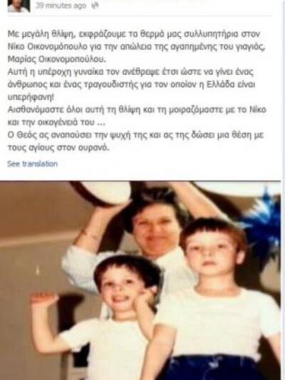 Την είδηση επιβεβαίωσε η επίσημη σελίδα του Νίκου στο facebook ανεβάζοντας μία φωτογραφία από την παιδική του ηλικία με την γιαγιά του.