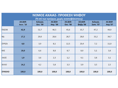 Ιδιαίτερη σημασία έχουν τέλος τα αντίστοιχα ποσοστά για τον Νομό Αχαΐας, ιδιαίτερα αν τα συγκρίνουμε και με αποτελέσματα ερευνών του παρελθόντος. Το ΠΑΣΟΚ παραμένει σταθερά πρώτο, αλλά με μεγάλη πτώση του ποσοστού του, πέφτοντας μάλιστα στα χαμηλότερα επιπεδά του των τελευταίων 2,5 ετών. Παράλληλα, το ΚΚΕ βρίσκεται στην δεύτερη θέση προτίμησης των Αχαιών, ξεπερνώντας τη Νέα Δημοκρατία για πρώτη φορά. Και σε αυτόν τον πίνακα τα αποτελέσματα προκύπτουν με αναγωγή, έπειτα από αφαίρεση των απεχόντων.