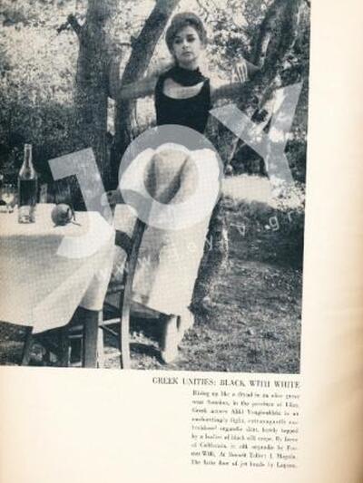 Εδώ η Αλίκη το 1960, σε φωτογράφηση στο Σούνιο για το γυναικείο αμερικάνικο περιοδικό – θρύλο « Harpers Bazaar» ως το πρόσωπο που εξέφραζε την ελληνική ομορφιά. Η λεζάντα της φωτογραφίας έγραφε: «Μια Ελληνίδα στο Harper’s Bazzar! Ελληνική αντίθεση: Μαύρο πάνω σε λευκό. Ακουμπισμένη σαν άλλη δρυάδα πάνω σε ένα δέντρο ελιάς, κοντά στο Σούνιο, σε ένα προάστιο της Ελλάδας. Η πιο διάσημη Ελληνίδα ηθοποιός, με μια γοητευτικά ανάλαφρη περίτεχνα κεντημένη φούστα από οργάντζα, με ένα μικρό μαύρο κορμάκι από μαύρο μεταξωτό κρεπ».