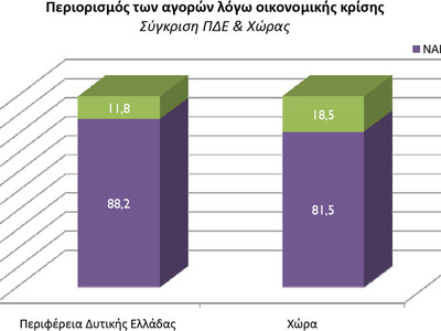 Όπως φαίνεται στο παραπάνω γράφημα, 88,2% των πολιτών της ΠΔΕ δηλώνουν ότι έχουν περιορίσει τα εξοδά τους, έναντι του 81,5% που έχει μετρηθεί για το σύνολο της χώρας. Στο νομό Αχαΐας, το ποσοστό δεν παρουσιάζει απόκλιση σε σχέση με το γενικό της ΠΔΕ, με το 88,1% των ερωτηθέντων να απαντούν ότι έχουν μειώσει τα εξοδά τους, και μόλις 11,9% αυτών να απαντούν "όχι". Εκ του συνόλου της Περιφέρειας Δυτικής Ελλάδας, όσοι έχουν μειώσει τα εξοδά τους, στην ερώτηση "Για ποιο λόγο κυρίως έχετε περιορίσει τις αγορές σας", το 71,8% απαντά "Επειδή έχει μειωθεί σημαντικά το εισοδημά μου", ένα 27,6% απαντά "Λόγω του κακού ψυχολογικού κλίματος που επικρατεί στην οικονομία", και ένα 0,6% απάντησε ΔΞ/ΔΑ.