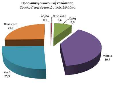 Μόλις 9 στους 100 κατοίκους της περιφέρειας αισθάνονται άνεση για τα οικονομικά τους, οι 88 στους 100 έχουν περιορίσει τις αγορές τους, καθώς 72 στους πολίτες ε'ιδαν το εισόδημά τους να μειώνεται σημαντικά. Και φυσικά, οι πολίτες γυρίζουν την πλάτη στα δύο μεγάλα κόμματα (όπως φάνηκε από τη δημοσκόπηση που δημοσιεύσαμ χθες), τα οποία προφανώς θεωρούν υπέυθυνα για την οικονομική τους κατάσταση.Τα ενδιαφέροντα αυτά στοιχεία που αποτυπώνουν την οικονομική κατάσταση στην περιοχή μας προκύπτουν από την δημοσκόπηση της DATA RC για τα οικονομικά των πολιτών της Περιφέρειας Δυτικής Ελλάδας.