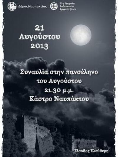 O Δήμος Ναυπακτίας, σε συνεργασία με την 22η Εφορεία Βυζαντινών Αρχαιοτήτων, διοργανώνουν μία ξεχωριστή συναυλία στην Πανσέληνο του Αυγούστου, την Τετάρτη 21/8 και ώρα 21:30 στο Κάστρο της Ναυπάκτου (τρίτο διάζωμα από τη θάλασσα).