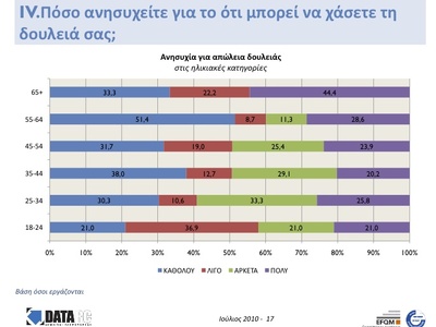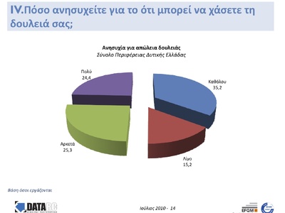 Ανυσηχυτικά στοιχεία προκύπτουν από την πρόσφατη έρευνα ΒΑΡΟΜΕΤΡΟ της DATA RC για την κατάσταση των εργαζομένων στην Δυτική Ελλάδα. Περίπου 50 στους 100 εργαζόμενους ανησυχούν ότι μπορεί να χάσουν τη δουλειά τους, ενώ μόλις 35 στους 100 δηλώνουν οτί αισθάνονται απόλυτη ασφάλεια για την θέση τους.