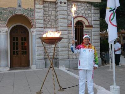 Σήμερα το πρωί, την Ολυμπιακή Φλόγα κατευόδωσε και μετέφερε, από την Εκκλησία στην Κεντρική Πλατεία των Καλαβρύτων μέχρι το Σταθμό του Τραίνου, ο Δήμαρχος Καλαβρύτων κ. Γιώργος Λαζουράς, για να συνεχίσει το ταξίδι της προς την Πάτρα.