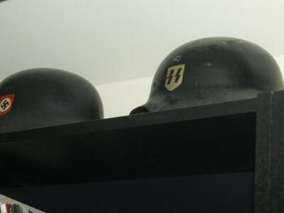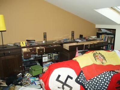 Εκτός από τα όπλα - ένα πιστόλι 9 mm LUGER και ένα εξάσφαιρο περίστροφο COLT 38 Special - που κατείχε παράνομα, στη μεζονέτα του υπαρχηγού της Χρυσής Αυγής βρέθηκαν επίσης, άδεια μπουκάλια κρασιού με τον Μουσολίνι να χαιρετά ναζιστικά στην ετικέτα, φωτογραφία του Αδόλφου Χίτλερ, στο πάνω μέρος της οποίας αναγράφεται «ΧΡΥΣΗ ΑΥΓΗ», πλήθος βιβλίων που αναφέρονται στους ναζί, σημαίες με τον αγκυλωτό σταυρό των ναζί και κράνη με τα διακριτικά των SS και τη σβάστικα.